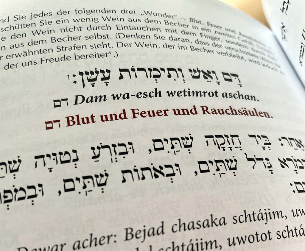 Ein interessantes sprachliches Detail dürfte dem aufmerksamen Benutzer und der aufmerksamen Benutzerin erst im Kontrast mit anderen Siddurim oder Haggadot auffallen: Die Anweisungen sind zu einem großen Teil aktiv formuliert: »Nehmen Sie…«, »Berühren Sie…« und nicht passiv, wie es häufig der Fall ist: »an dieser Stelle nimmt man…«. Das mag ein Detail sein, aber diese Art der Ansprache wirkt auf den Leser anders, vielleicht weniger distanziert.